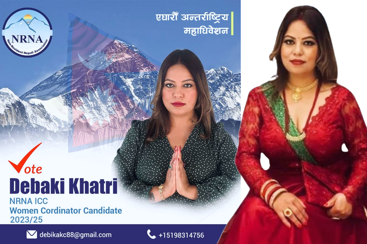 नमस्कार !! गैर आवासीय नेपाली संघ (एनआरएनए ) अन्तराष्ट्रिय समन्वय परिषदको आगामी अक्टोवर १७-१९ ( असोज ३० – कार्तिक २) मा हुने निर्वाचनमा मैले (आइ सी सी )महिला संयोजकमा उम्मेदवारी दिएकी छु। हजुरको अमूल्य समर्थन र सहयोगको अपेक्षा लिएर अगाडी बढ्ने जमर्को गर्दै छु! हजुरहरुको साथ – सद्भाव ,हौसला र प्रेरणा ले मलाई सदैव मार्गनिर्देशन गरिरहेको छ, गरिरहने छ। मलाइ पुर्ण विश्वास छ – हजुर प्रति।। गायीका देविका के सि (देवकी खत्री) हाल -क्यानडा 🙏🙏