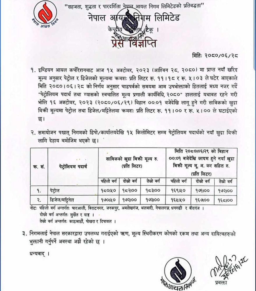 भारतीय आयल कर्पोरेसन (आईओसी) बाट घटेर नयाँ मूल्य प्राप्त भएका कारण मूल्य समायोजन गरिएको निगमले जनाएको छ । नयाँ मूल्यअनुसार काठमाडौं उपत्यकामा पेट्रोलको मूल्य प्रतिलिटर १७३ रुपैयाँमा झरेको छ भने डिजेलको प्रतिलिटर मूल्य १६८ रुपैयाँ पर्नेछ ।