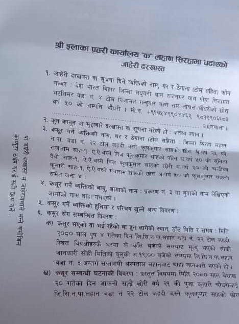 यता, इलाका प्रहरी कार्यालय लहानका प्रहरी निरीक्षक अभिनाश अधिकारीले मृतक पूजाको पोष्टमार्टमको रिपोर्ट कुरेर बसेको र रिपोर्ट आएपछि मात्र जाहेरी दर्ता गर्न सकिने बताए । घटना विषयमा अनुसन्धान भइरहेको र फोनमा सबै कुरा भन्न नमिल्ने उनको भनाई छ ।