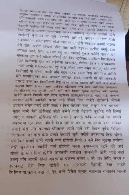 उनका अनुसार विवाह गरेर लगेको केहि महिना नबित्दै थप दाइजोका लागि छोरीलाई यातना दिन थाल्यो । पटक पटक कुटपिट गर्न थालेपछि थप ८० हजार रुपैयाँ गएर सम्धी ९पूजाकी ससुरा०लाई दिएको थिए । तर थप ३ लाख २० हजार रुपैयाँ माग्न थाल्यो । सम्पत्तिले जाहेरीमा लेखेका छन्, ‘सोफोसेट, गोदरेज, फ्रिज र व्यवसाय गर्नका लागि २ लाख भारु (३ लाख २० हजार नेरु) मागेर ल्याऊ अनि मात्र घरमा राख्छु भनेर छोरीलाई दबाब दिन थाल्यो । मेरो घरको अवस्था कमजोर रहेकाले छोरीले यो कुरा हामीलाई नबताई हिंसा भोग्दै आएकी थिइन् । एक हप्तादेखि यातना दिँदै पौष ४ मा मेरो छोरीको हत्या गरियो ।’