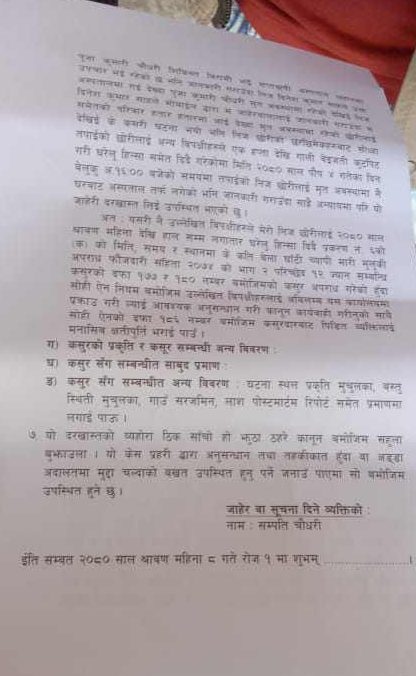 घाँटी च्यापेर छोरी पूजाको हत्या गरेकोले संलग्न उनका श्रीमान्, सासू, ससुरा र नन्दलाई मुलुकी अपराध फौजदारी संहिता १७७ र १८० बमोजिमको कसुर अपराध अन्तर्गत कर्तव्य ज्यान मुद्दा चलाई हदैसम्मको कारबाही गर्न सम्पत्तिले माग गरेका छन् । उनले पटक पटक इलाका प्रहरी कार्यालय पुगेर जाहेरी दर्ता गराउन खोज्दा पनि प्रहरीले नमानेको गुनासो गरे । उनले भने, ‘दाइजोकै निहुँमा छोरीको हत्या गरिएको छ । तर प्रहरीले घटनाको छानबिन पनि गर्न चाहेको छैन । न्यायका लागि हजुरहरूले पहल गरिदिनपर्‍यो ।’