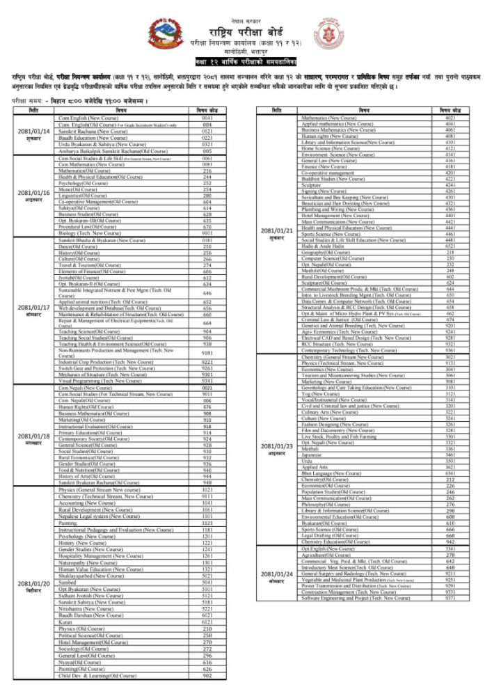 काठमाडौँ । कक्षा १२ को वार्षिक परीक्षाको समय तालिका सार्वजनिक भएको छ । राष्ट्रिय परीक्षा बोर्ड, परीक्षा नियन्त्रण कार्यालय भक्तपुरले २०८१ वैशाख १४ गतेदेखि हुने परीक्षाको समय तालिका सार्वजनिक गरेको हो ।