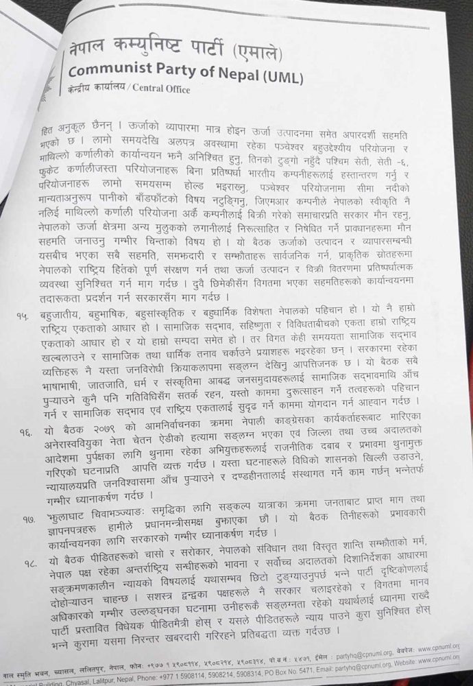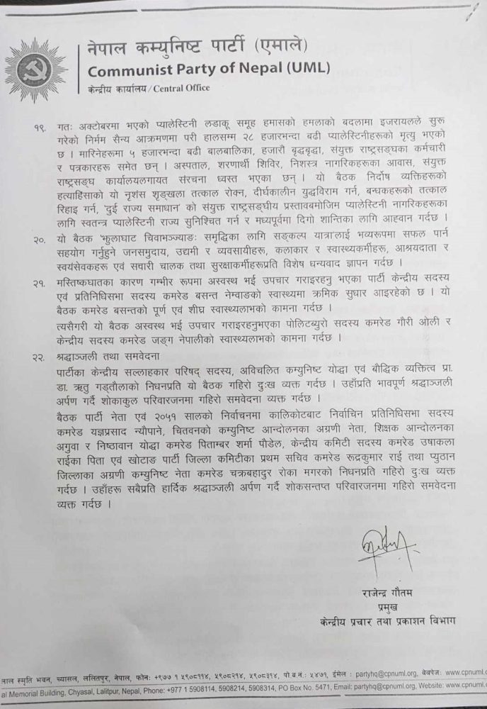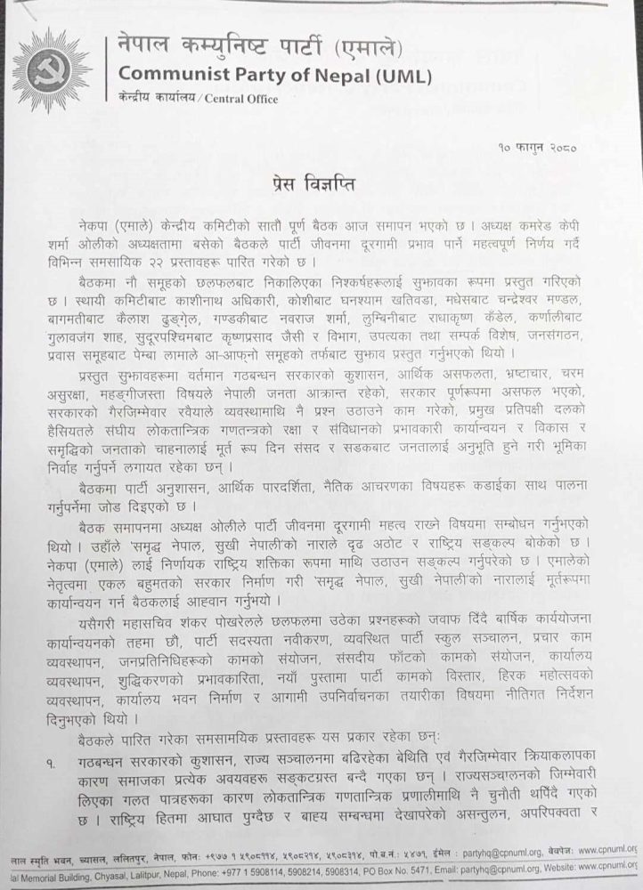 काठमाडौं । प्रमुख प्रतिपक्षी दल नेकपा (एमाले) ले आगामी वर्षलाई पार्टीको शुद्धीकरण र सुदृढीकरणको वर्षको रुपमा अघि बढाउने निर्णय गरेको छ। तीन दिनसम्म चलेको केन्द्रीय कमिटीको बैठकले पार्टीलाई नयाँ उचाइमा पुर्याउने लक्ष्यका साथ पार्टीलाई अघि बढाउने निर्णय गरेको हो। बैठकले २२ बुँदे निर्णय गरेको छ।