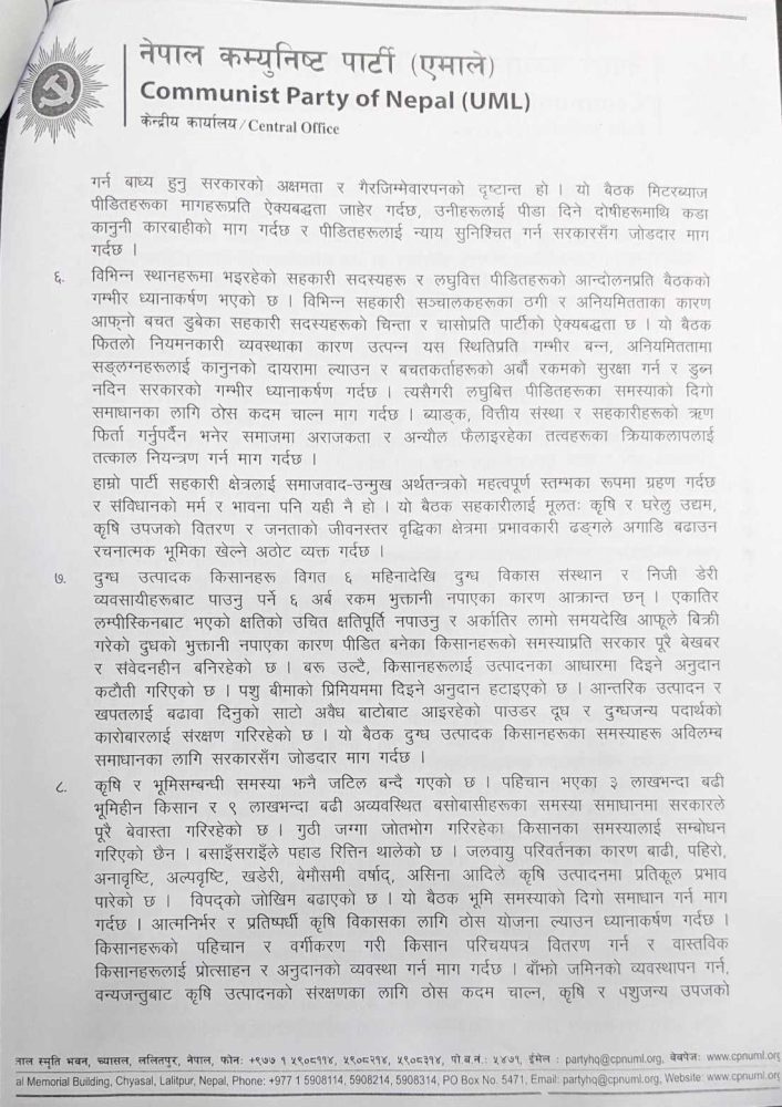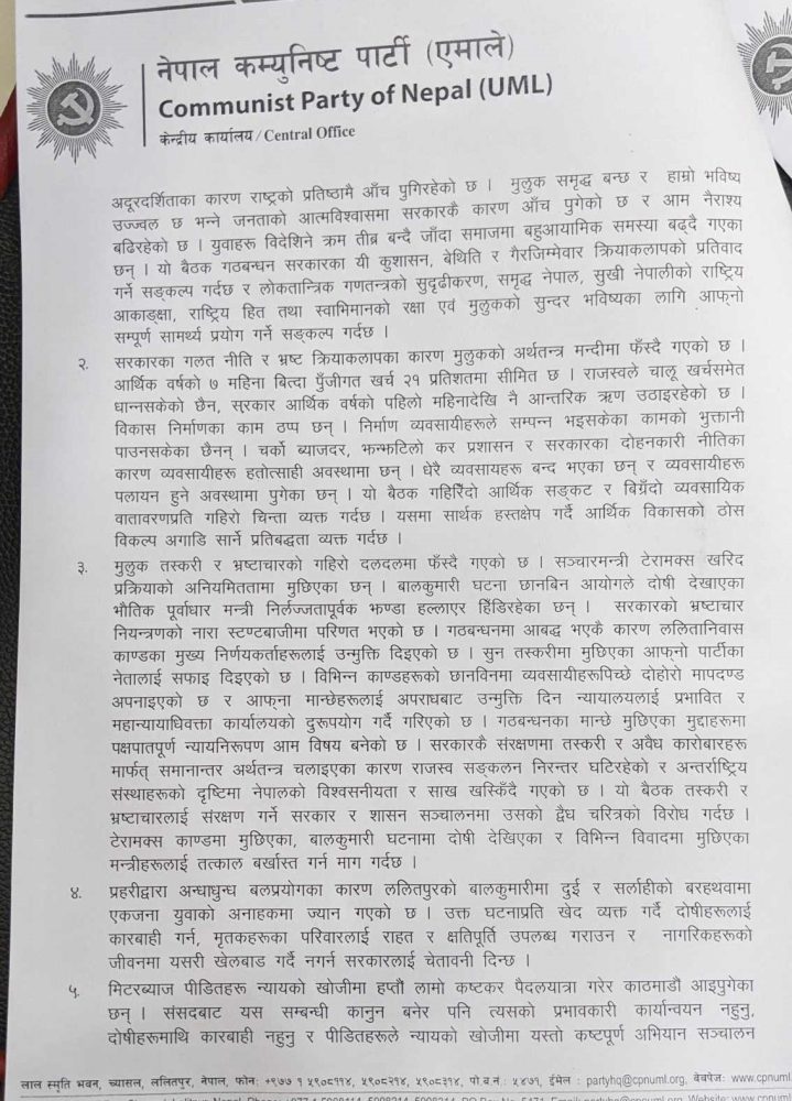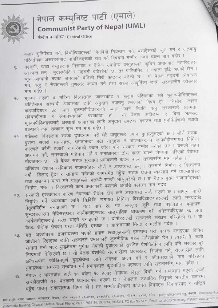 बैठकपछि केन्द्रीय प्रचार विभाग प्रमुख राजेन्द्र गौतमले जारी गरेको विज्ञप्तिमा देश र जनताको सरोकारको मुद्दामा जनदबाब र जनपरिचालको अजेण्डा छिट्टै सार्वजनिक गर्ने बताउँदै सदन र आवश्यक परे सडकमा पनि आवाज उठाउने उल्लेख गरेका छन् ।