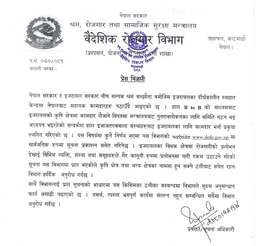 विभागका अनुसार यस विषयमा कुनै निर्णय नभएकाले भएमा विभागको वेबसाइटबाट सार्वजनिक रुपमा सूचना प्रकाशन गर्ने बताएको छ । त्यस्तै इजरायलका विभिन्न क्षेत्रमा रोजगारीको प्रलोभन देखाएर विभिन्न व्यक्ति, संस्था तथा समूहहरुले गैरकानूनी रुपमा रकम उठाउने गरेको सूचना विभागमा प्राप्त भएकाले कृषि क्षेत्र तथा अन्य क्षेत्रका नाममा हुन सक्ने ठगीबाट सचेत रहन विभागले सबैलाई आग्रह गरेको छ ।