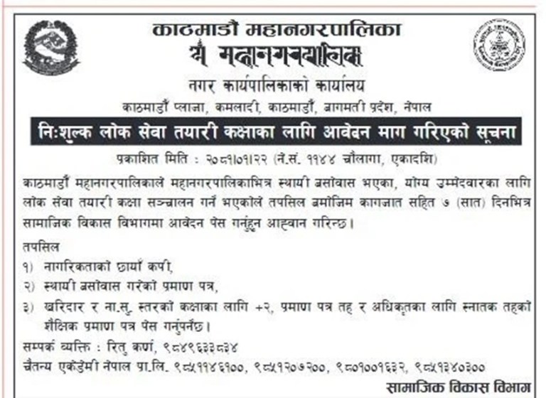 काठमाडौं । काठमाडौं महानगरपालिकाले लोकसेवा तयारी कक्षा सञ्चालनका लागि आवेदन आह्वान गरेको छ । महानगरपालिकाले आज एक सूचना जारी गरी निःशुल्क कक्षा सञ्चालनका लागि आवेदन आह्वान गरेको हो ।