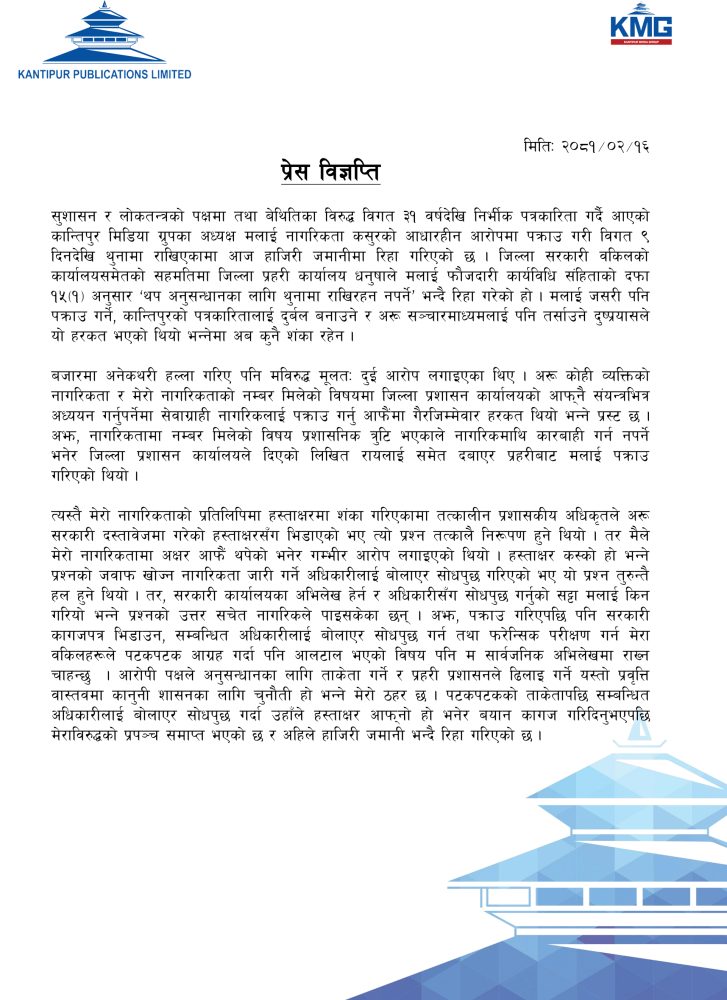 कान्तिपुर मिडिया ग्रुपका अध्यक्षलाई नागरिकता कसुरको अभियोगमा पक्राउ गरी विगत ९ दिनदेखि थुनामा राखिएकामा आज हाजिरी जमानीमा रिहा गरिएको छ । जिल्ला सरकारी वकिलको कार्यालयसमेतको सहमतिमा जिल्ला प्रहरी कार्यालय धनुषाले फौजदारी कार्यविधि संहिताको दफा १५ (१) अनुसार ‘थप अनुसन्धानका लागि थुनामा राखिरहन नपर्ने’ भन्दै रिहा गरेको हो ।