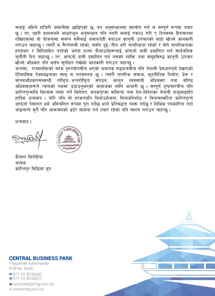 नेपाली प्रेस जगत्ले आफूप्रति देखाएको ऐतिहासिक ऐक्यबद्धताका सामु आफू नतमस्तक रहेको पनि बताउँदै थप अनुसन्धानमा सहयोग गर्न सम्पूर्ण रूपमा तयार रहेको उनले बताएका छन् । ‘मलाई जसरी पनि पक्राउ गर्ने, कान्तिपुरको पत्रकारितालाई दुर्बल बनाउने र अरू सञ्चारमाध्यमलाई पनि तर्साउने दुष्प्रयासले यो हरकत भएको थियो भन्नेमा अब कुनै शंका रहेन,’ उनले भनेका छन्, ‘प्रहरी प्रशासनले आधारभूत अनुसन्धान पनि नगरी मलाई पक्राउ गरी ९ दिनसम्म हिरासतमा राखिएकामा यो योजनामा संलग्न सबैलाई जवाफदेही बनाउन कानूनी उपचारको बाटो खोज्ने जानकारी गराउन चाहन्छु ।’