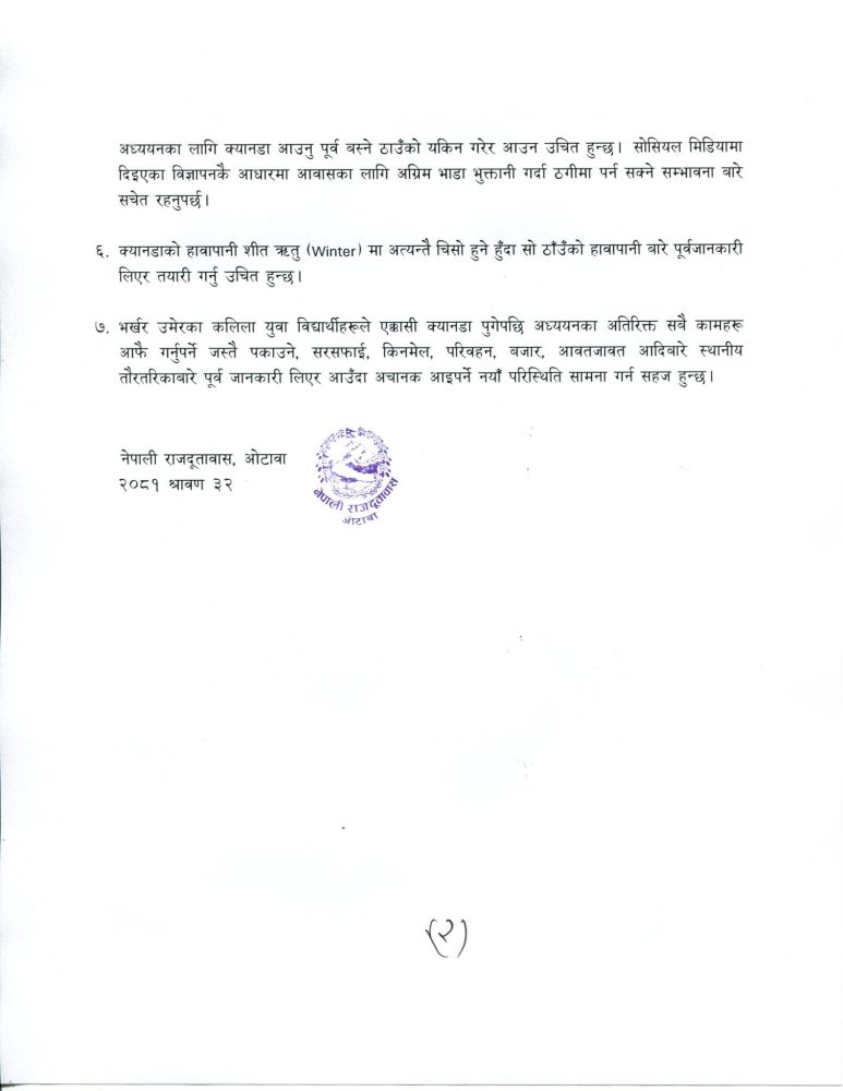 १ भदौ, काठमाडौं । अध्ययनका लागि क्यानडा जाने तयारीमा रहेका विद्यार्थीका लागि दूतावासले ७ सुझाव दिंदै सचेत गराएको छ । अहिले विश्वभरबाट क्यानडा आउने विद्यार्थीको संख्या बढिरहेकोले डेरा र रोजगारी पाउने अवसर कठिन हुँदै गएकोबारे दूतावासले स्मरण गराएको छ । त्यसैले क्यानडा जानुअघि बस्ने ठाउँको यकिन गर्न सुझाव दिएको छ ।