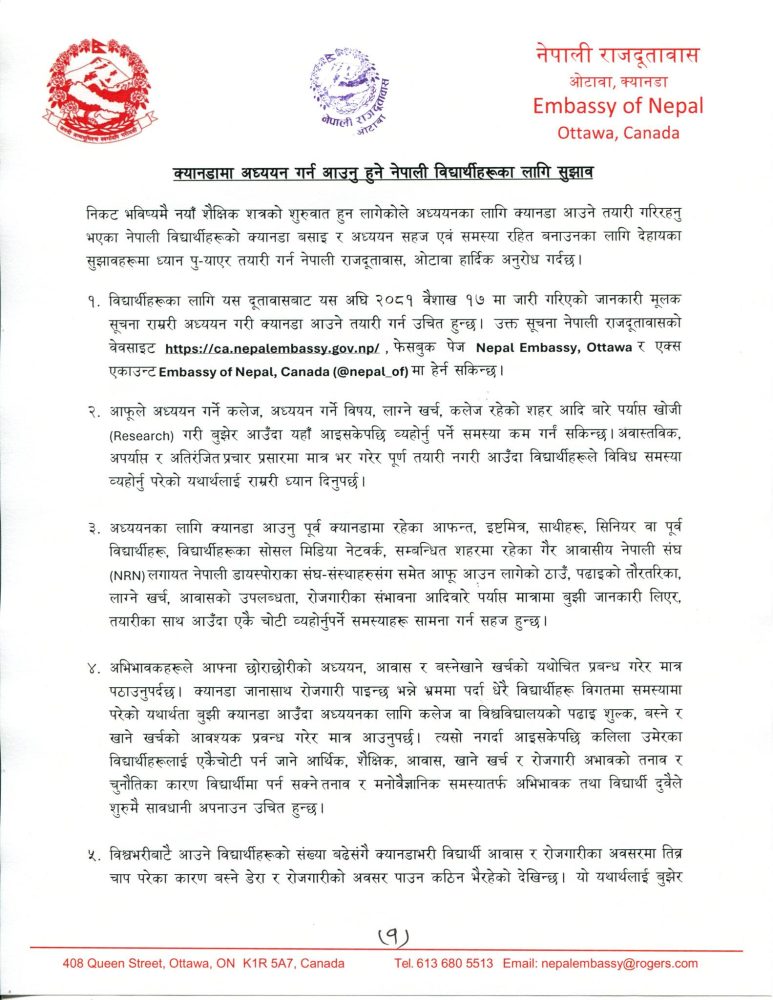क्यानडा जाने विद्यार्थीलाई दूतावासले जारी गर्यो यी ७ बुँदे सुझाव