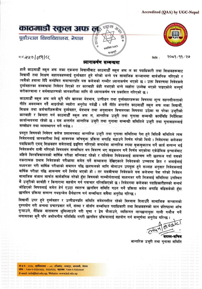 काठमाडौं । चर्चित वक्ता ‘काठमाडौं स्कुल अफ ल’ (केएसएल) का संस्थापक युवराज संग्रौलामाथि विद्यार्थीलाई दुर्व्यवहार गरेको गम्भीर आरोप लागेको छ।