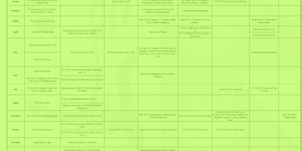 २४ फागुन, काठमाडौँ । नेपाल क्रिकेट संघ (क्यान)ले वार्षिक क्यालेण्डर सार्वजनिक गरेको छ ।