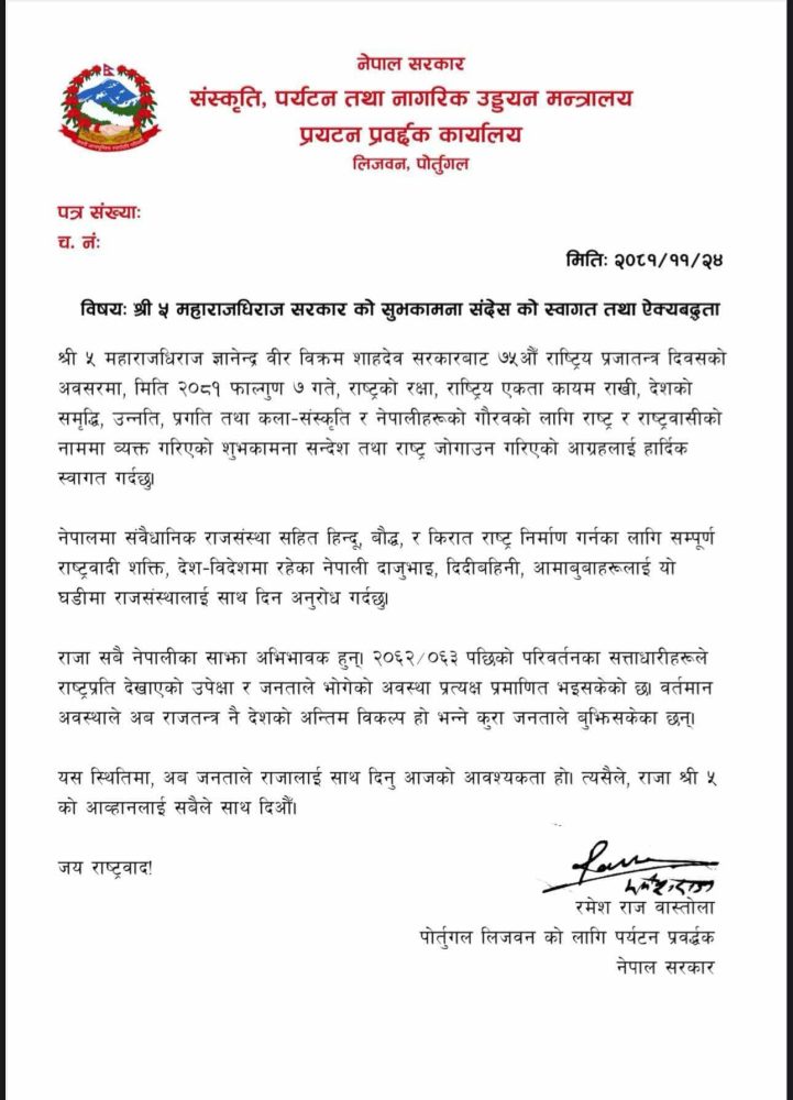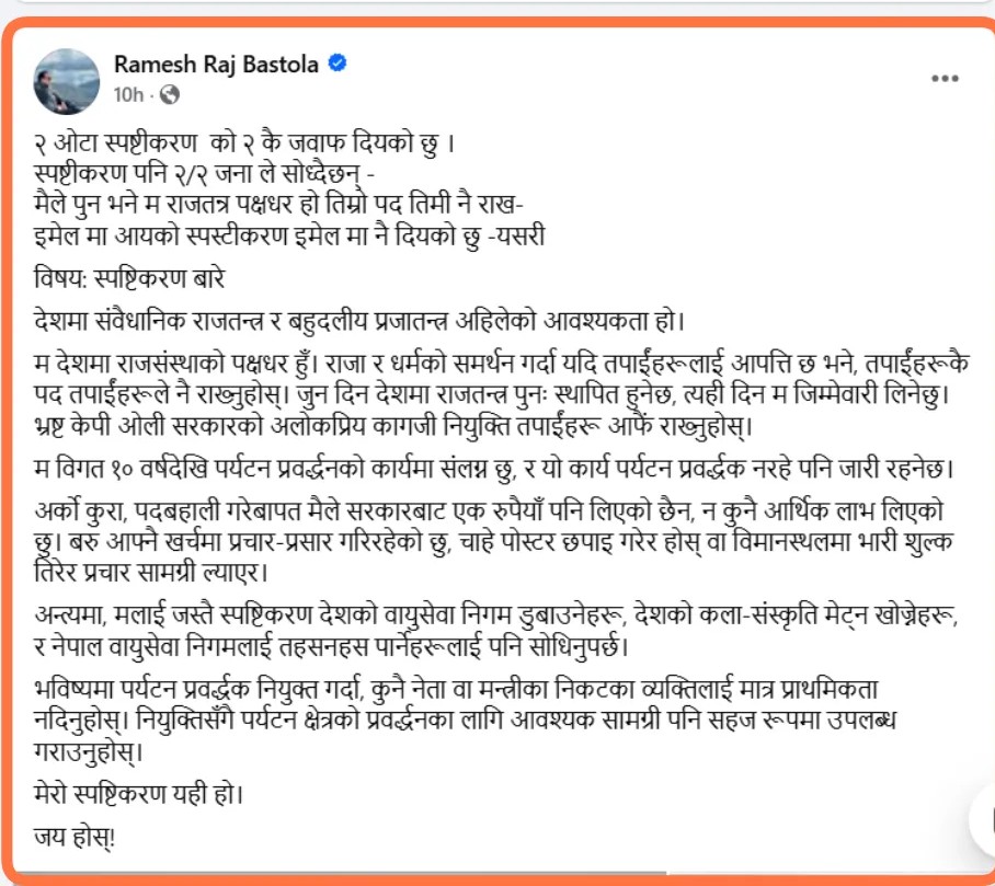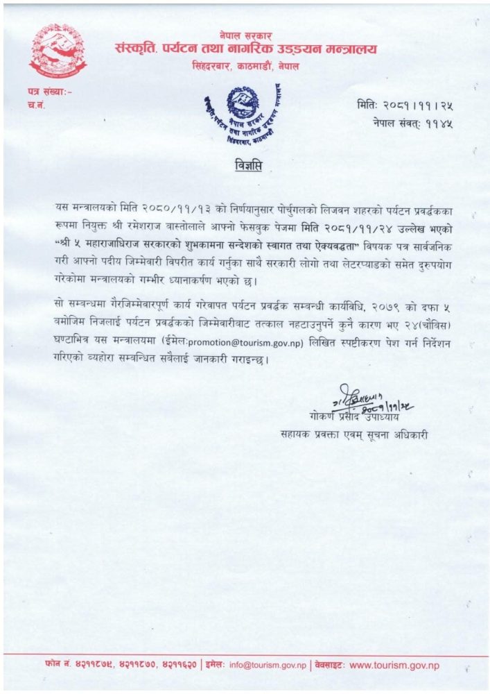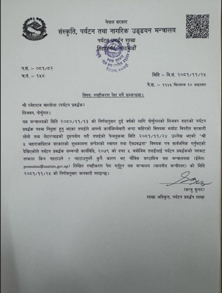 काठमाडौँ । पर्यटन प्रवर्द्धक रमेशराज बास्तोलाले पूर्वराजा ज्ञानेन्द्रलाई ‘श्री ५’ को सम्बोधन गर्दै समर्थन जनाएपछि संस्कृति, पर्यटन तथा नागरिक उड्डयन मन्त्रालयले २४ घण्टे स्पष्टीकरण सोधेपछि उनले सामाजिक सञ्जालमार्फत जवाफ दिएका छन्।