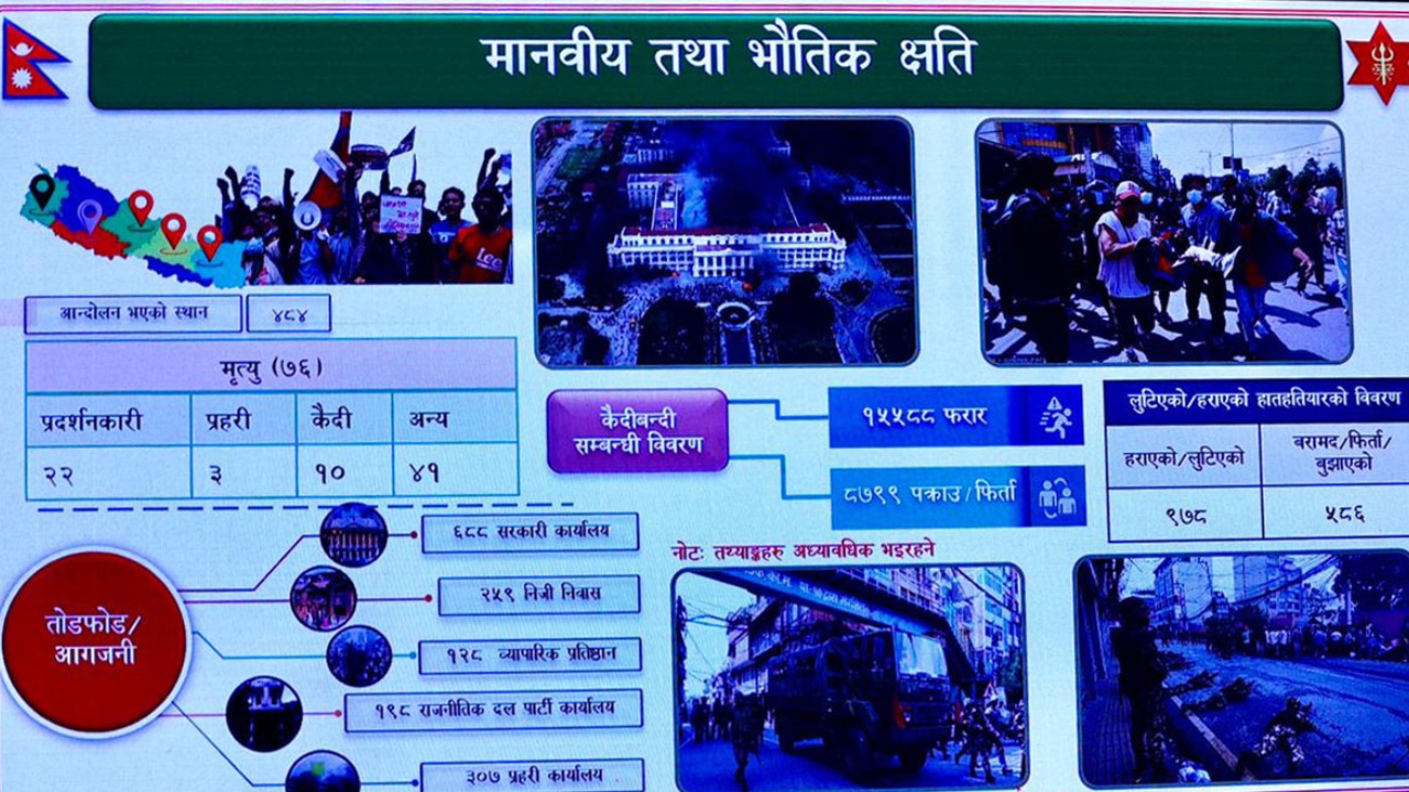 शुक्रबार आयोजित पत्रकार सम्मेलनमा युद्ध कार्य विभागका प्रमुख उपरथी अनुपजंग थापाले ७६ जनाको मृत्यु भएको बताउँदै तीमध्ये २२ प्रदर्शनकारी, तीन प्रहरी, १० कैदी र ४१ अन्य रहेको जानकारी दिए।