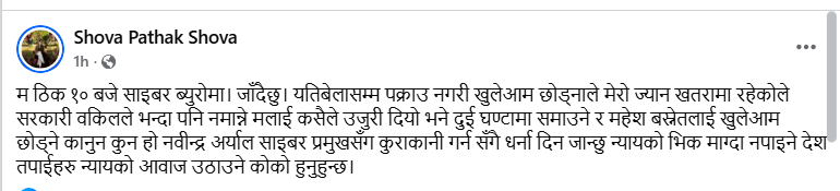 म ठिक १० बजे साइबर ब्युरोमा। जाँदैछु। यतिबेलासम्म पक्राउ नगरी खुलेआम छोड्नाले मेरो ज्यान खतरामा रहेकोले सरकारी वकिलले भन्दा पनि नमान्ने मलाई कसैले उजुरी दियो भने दुई घण्टामा समाउने र महेश बस्नेतलाई खुलेआम छोड्ने कानून कुन हो ? नवीन्द्र अर्याल साइबर प्रमुखसँग कुराकानी गर्न सँगै धर्ना दिन जान्छु । न्यायको भिक माग्दा नपाइने देश तपाईहरु न्यायको आवाज उठाउने कोको हुनुहुन्छ ?