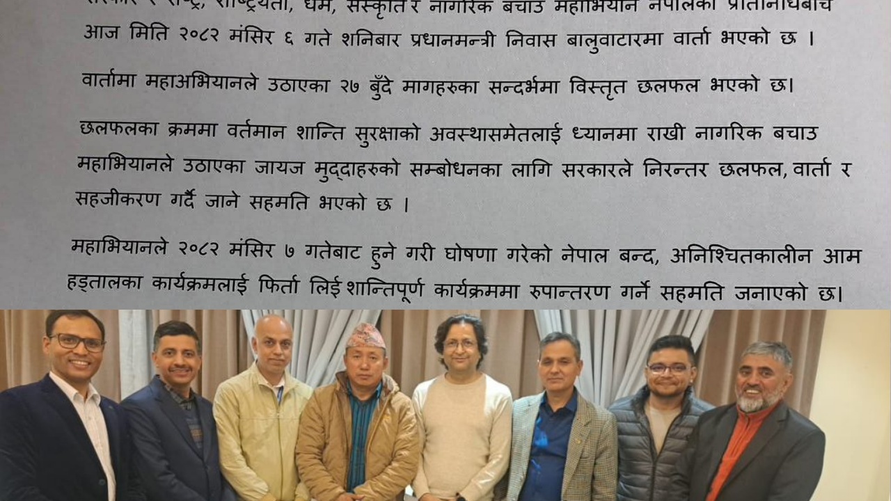 सरकारसँग बालुवाटारमा भएको वार्तापछि महाअभियानले नेपाल बन्द, अनिश्चितकालीन आमहड्ताललगायत कार्यक्रम रोक्ने निर्णय गरेको हो।