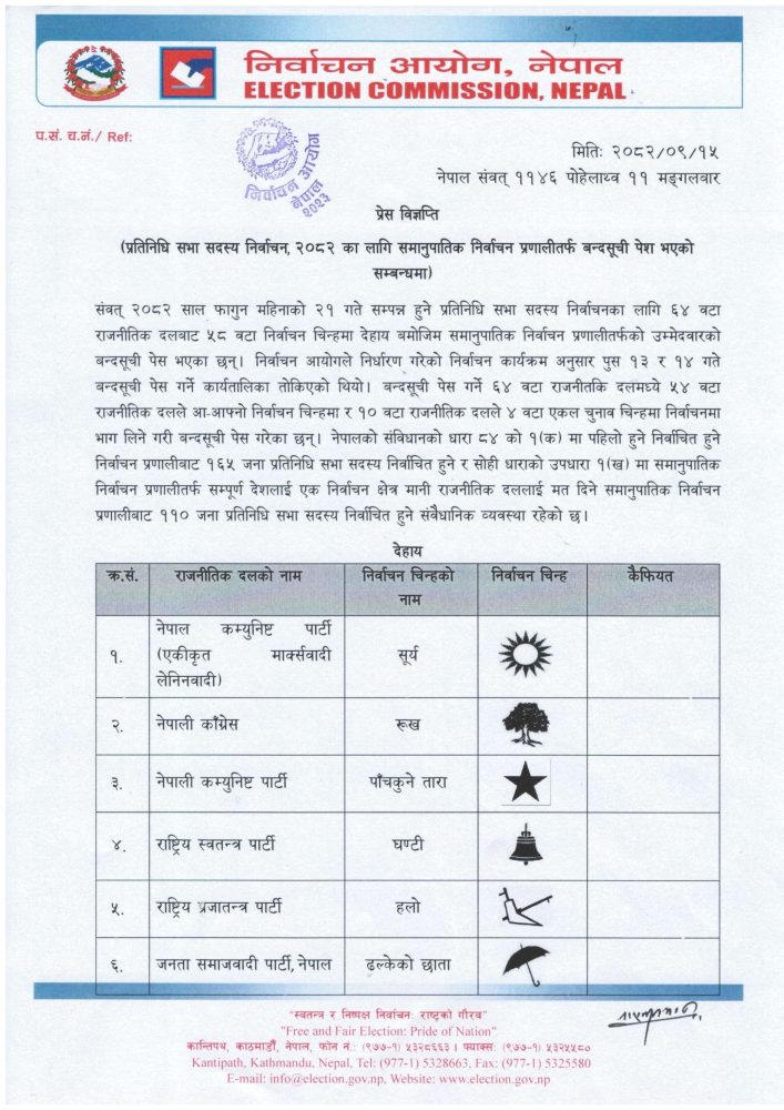 काठमाडौँ । प्रतिनिधिसभा सदस्य निर्वाचन २०८२ का लागि राजनीतिक दलहरूले समानुपातिक निर्वाचन प्रणालीतर्फ उम्मेदवारको बन्दसूची पेस गरेका छन्। निर्वाचन आयोगका अनुसार फागुन २१ गते हुने निर्वाचनका लागि ६४ दलबाट ५८ वटा निर्वाचन चिह्नमा बन्दसूची दर्ता भएको छ।