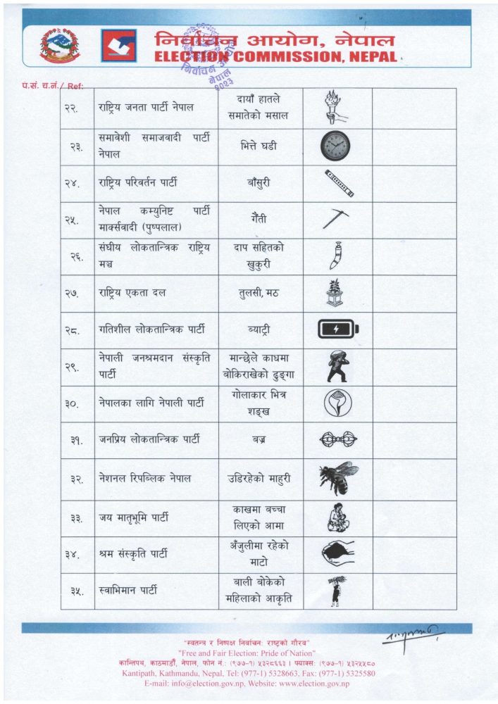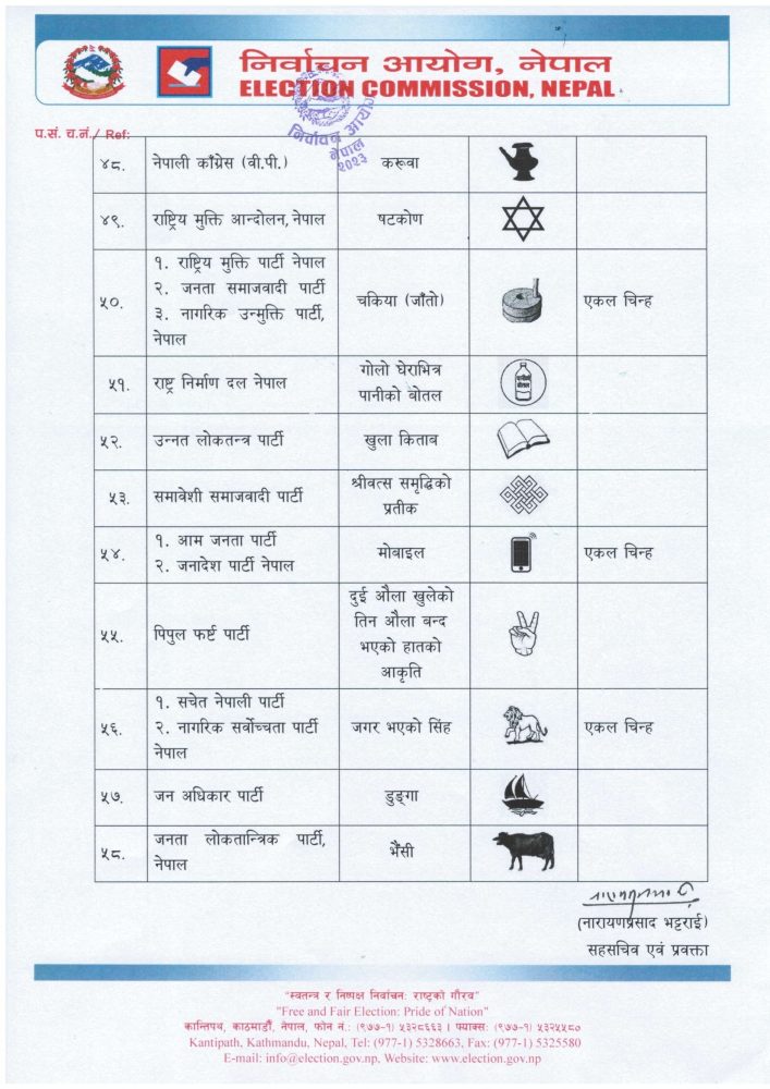आयोगले तोकेको पुस १३ र १४ गतेको अवधिमा ५४ दलले आफ्नै चुनाव चिह्न प्रयोग गरेका छन् भने १० दलले ४ वटा एकल चुनाव चिह्नमार्फत निर्वाचनमा भाग लिने गरी बन्दसूची बुझाएका हुन्।