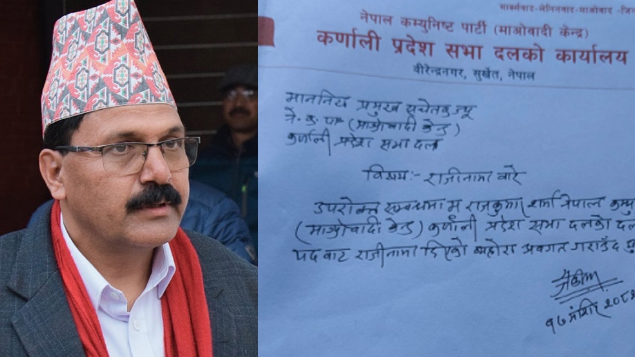 काठमाडौं । नेकपा (माओवादी केन्द्र) कर्णाली प्रदेश सभा संसदीय दलका नेता राजकुमार शर्माले बुधबार दलको नेताबाट राजीनामा दिएका छन्। प्रमुख सचेतक कृष्णबहादुर जिसीलाई सम्बोधन गरिएको राजीनामा पत्रमा उनले अब आफू उक्त पदमा नबस्ने बताएका हुन्।