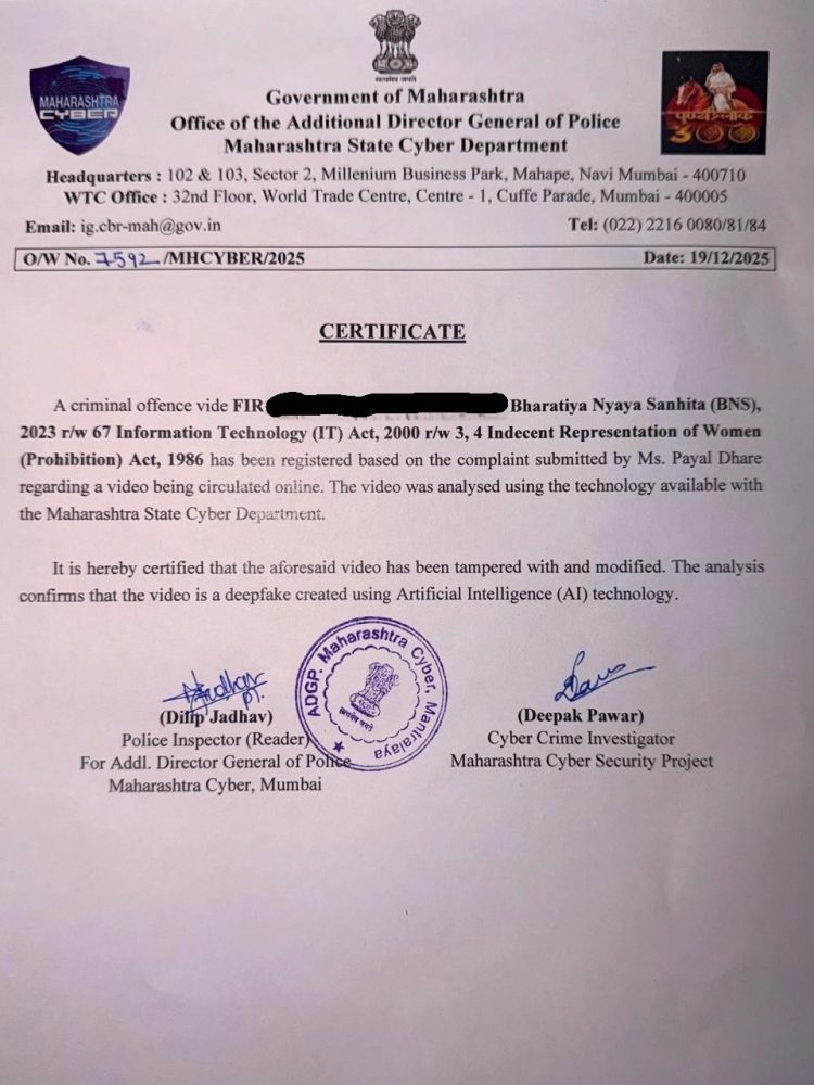 महाराष्ट्र साइबर प्रहरीले FIR No. 52/2025 दर्ता गर्दै भिडियो बनाउने र फैलाउनेहरू विरुद्ध भारतीय न्याय संहिता (BNS), आईटी एक्ट र महिलाको अभद्र प्रदर्शन (निषेध) ऐनका गम्भीर धाराहरू अन्तर्गत मुद्दा दर्ता गरेको छ।