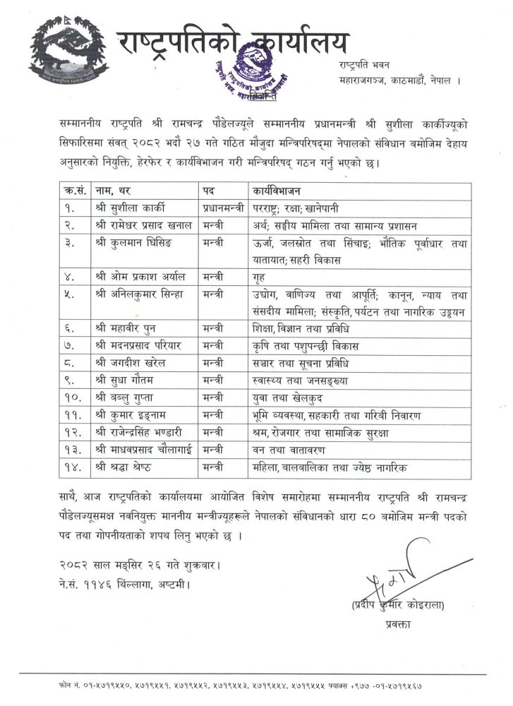 नयाँ मन्त्रीहरूमा कुमार इङ्नाम (भूमि व्यवस्था, सहकारी तथा गरिबी निवारण), राजेन्द्रसिंह भण्डारी (श्रम, रोजगार तथा सामाजिक सुरक्षा), माधवप्रसाद चौलागाई (वन तथा वातावरण) र श्रद्धा श्रेष्ठ (महिला, बालबालिका तथा ज्येष्ठ नागरिक) रहेका छन्। यससँगै सुशीला कार्की नेतृत्वको सरकार १४ सदस्यीय बनेको छ।