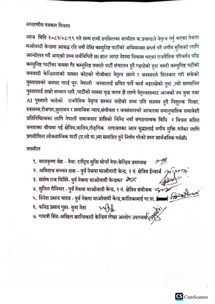 नेताहरूले पार्टीमा नेतृत्वको चयन जनस्तरबाट नभई कोटको गोजीबाट हुने, जनतालाई भ्रमित पार्ने कार्य भएको भन्दै प्रचण्डको साथ छाडेका हुन्। उनीहरूले निःशुल्क शिक्षा, स्वास्थ्य, रोजगार, सुशासन र सामाजिक न्यायका लागि नयाँ सङ्गठनात्मक विधि सहित प्रगतिशील लोकतान्त्रिक पार्टी (प्रलोपा) मा प्रवेश गर्ने निर्णय गरेका छन्।