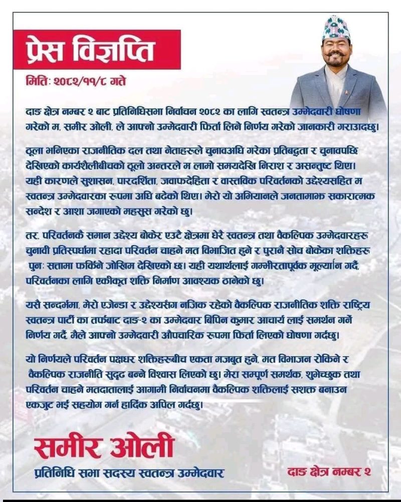 काठमाण्डौँ । दाङ क्षेत्र नम्बर २ बाट प्रतिनिधिसभा निर्वाचन २०८२ का लागि स्वतन्त्र उम्मेदवारी घोषणा गरेका समीर ओलीले आफ्नो उम्मेदवारी फिर्ता लिने निर्णय गरेका छन् । एक बक्तब्य जारी गर्दै उनले उम्मेदवारी फिर्ता लिएको घोषणा गरेका हुन् । दाङ क्षेत्र नम्बर २ बाट प्रतिनिधिसभा निर्वाचन २०८२ का लागि स्वतन्त्र उम्मेदवारी घोषणा गरेको म, समीर ओली, ले आफ्नो उम्मेदवारी फिर्ता लिने निर्णय गरेको जानकारी गराउँछु।