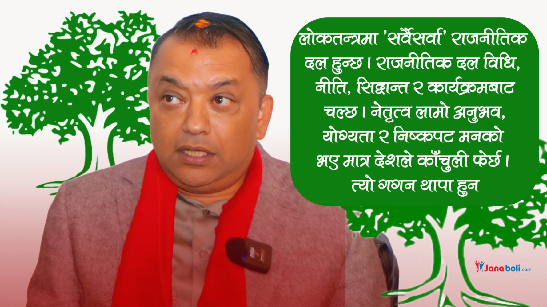 पार्टीको तल जरादेखि अनुभव बटुल्दै फल पाक्न पुगेको यो नेतृत्वलाई नेपालीले साथ दिएनौं भने नेपालले ठूलो मूल्य चुकाउँछ । भावी पुस्ताले धिक्कार्छ । किनकी राजतन्त्रमा सर्वैसर्वा राजा हुन्छ भने, लोकतन्त्रमा ‘सर्वैसर्वा’ राजनीतिक दल हुन्छ । राजनीतिक दल विधि, नीति, सिद्वान्त र कार्यक्रमबाट चल्छ । नेतृत्व लामो समयको अनुभव, योग्यता र पवित्र, निष्कपट मनबाट उत्कृष्ट बन्छ । लोकतन्त्रमा दलको प्रयोग, टीम परिचालन, उत्कृष्ट नीति तथा कार्यक्रम बनाउँन नसक्नेको हातमा देश पुग्यो भने, फेरि समय बर्बाद हुन्छ । यसैले अहिले नेपाली धर्ती उजिल्याउन सारा नेपाली गगनमा समाहित हुने समय हो ।’