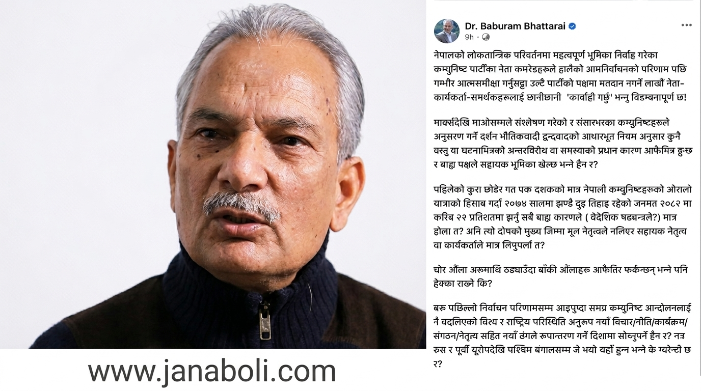 प्रकाश काफ्ले/काठमाडौं । पूर्वप्रधानमन्त्री तथा नेपाल समाजवादी पार्टीका अध्यक्ष डा. बाबुराम भट्टराईले हालै सम्पन्न आमनिर्वाचनको परिणामपछि नेपालका कम्युनिष्ट नेताहरूको कडा आलोचना गर्नुभएको छ। शनिबार सामाजिक सञ्जालमार्फत आफ्नो धारणा राख्दै उहाँले निर्वाचनमा व्यहोरेको लज्जास्पद हारपछि नेतृत्वले “छानीछानी कारवाही गर्छु” भन्नु विडम्बनापूर्ण भएको टिप्पणी गर्नुभएको छ।