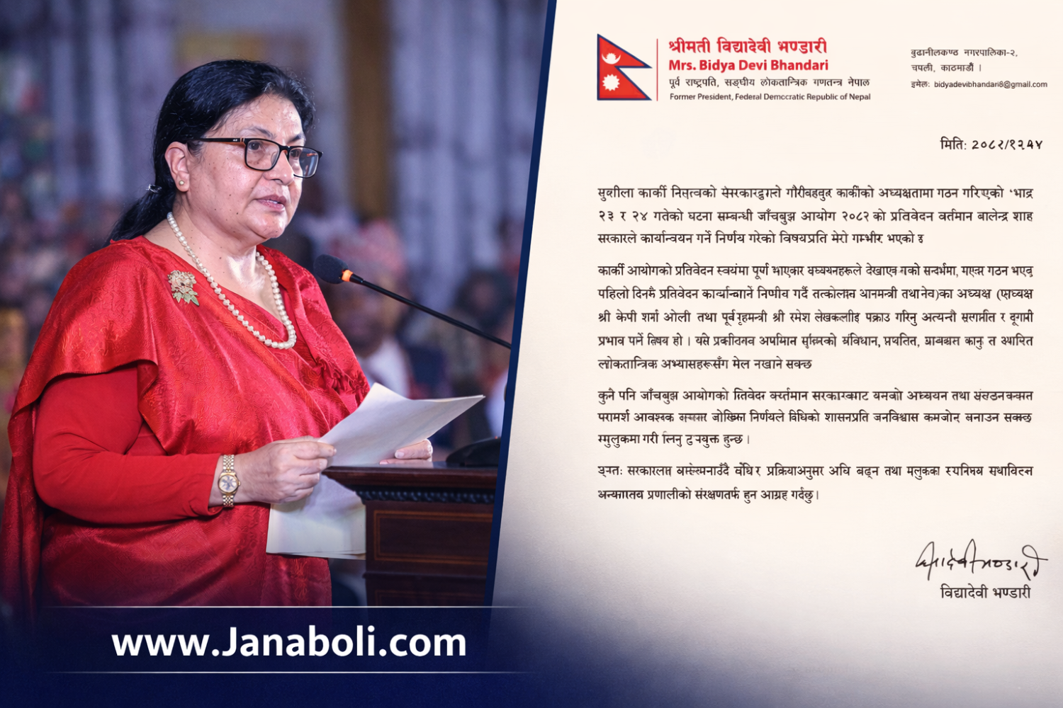 प्रकाश काफ्ले/काठमाडौं । पूर्वराष्ट्रपति विद्यादेवी भण्डारी ले वर्तमान सरकारको हालैको निर्णयप्रति गम्भीर आपत्ति जनाउँदै यसलाई अपरिपक्व कदमको रूपमा व्याख्या गरेकी छन्। उनले बालेन्द्र शाह नेतृत्वको सरकारद्वारा कार्की आयोगको प्रतिवेदन कार्यान्वयन गर्ने निर्णय हतारमा गरिएको भन्दै चिन्ता व्यक्त गरिन्।