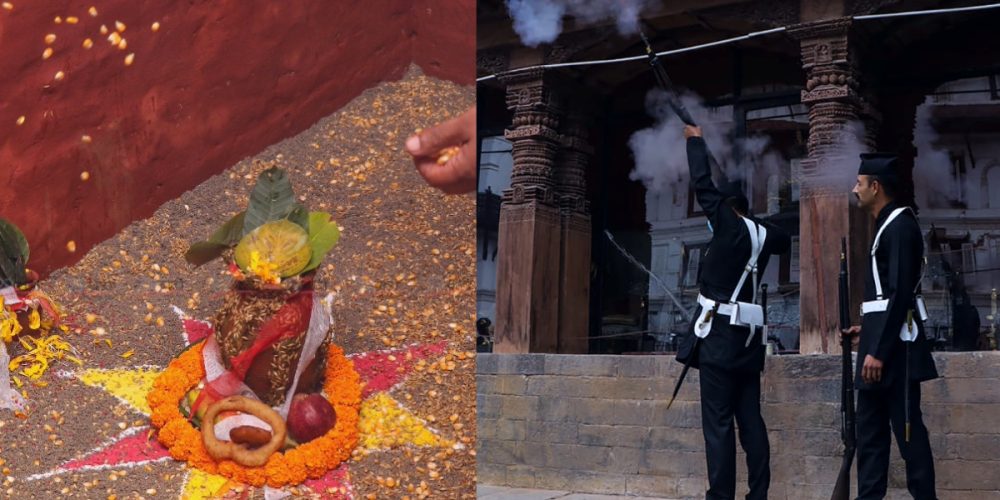 मंगल धुन र बन्दुक पड्काएर बढाइँसहित हनुमानढोकास्थित दसैँघरमा राखियो जमरा