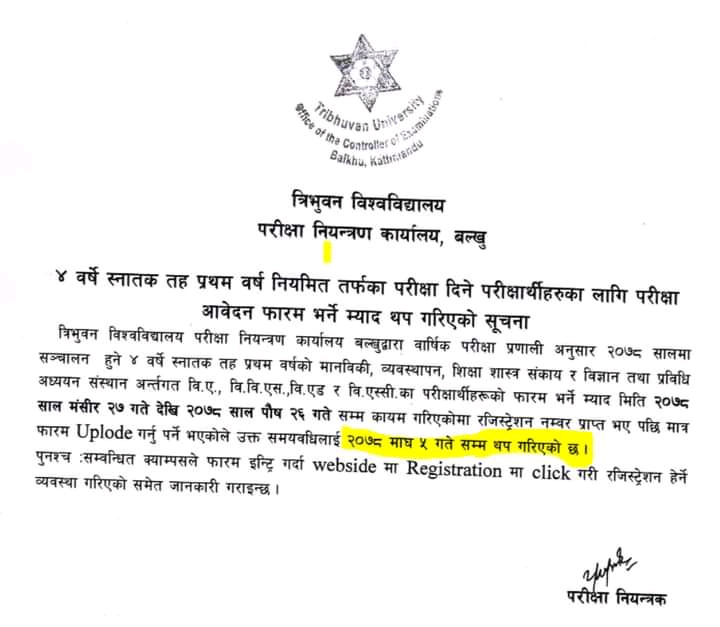 त्रिभुवन विश्वविद्यालय परीक्षा नियन्त्रण कार्यालय बल्खुद्धारा बार्षिक परीक्षा प्रणाली अनुसार २०७८ सालमा सञ्चालन हुने ४ बर्षे स्नातक तह प्रथम बर्षको मानविकी, व्यवस्थापन, शिक्षा शास्त्र संकाय र विज्ञान तथा प्रविधि अध्ययन संस्थान अन्तर्गत बि.ए., वि.वि.एस. , वि. एड. र वि. एस्सी. का परीक्षार्थीहरुको फारम भर्ने मिति २०७८ माल मंसिर २७ गतेदेखि २०७८ साल पौस २६ गतेसम्म कायम गरिएकोमा रजिष्ट्रेशन नम्वर प्राप्त भएपछि मात्र फारम अपलोड गर्नुपर्ने भएकाले उक्त समयवधिलाई २०७८ माघ ५ गतेसम्म थप गरिएको छ ।