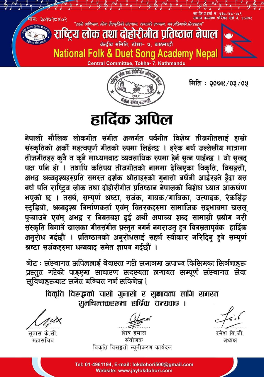 तसर्थ सम्पूर्ण स्रष्टा सर्जक गायक÷गायिका, उत्पादक, रेकर्डिङ्ग स्टुडियो, श्रव्यदृश्य निर्माणकर्ता एवं वितरकहरुमा सामाजिक सद्भावमा खलल पुर्याउने एवं अभद्र र नियतबस दुई अर्थी लाग्ने अपाच्य शब्द सामग्री प्रयोग गरी संगीत बिगार्ने खालका गीत संगीत प्रस्तुत नगर्न नगराउन विनम्र बिनम्रतापूर्वक हार्दिक अनुरोध गर्दछौं ।’